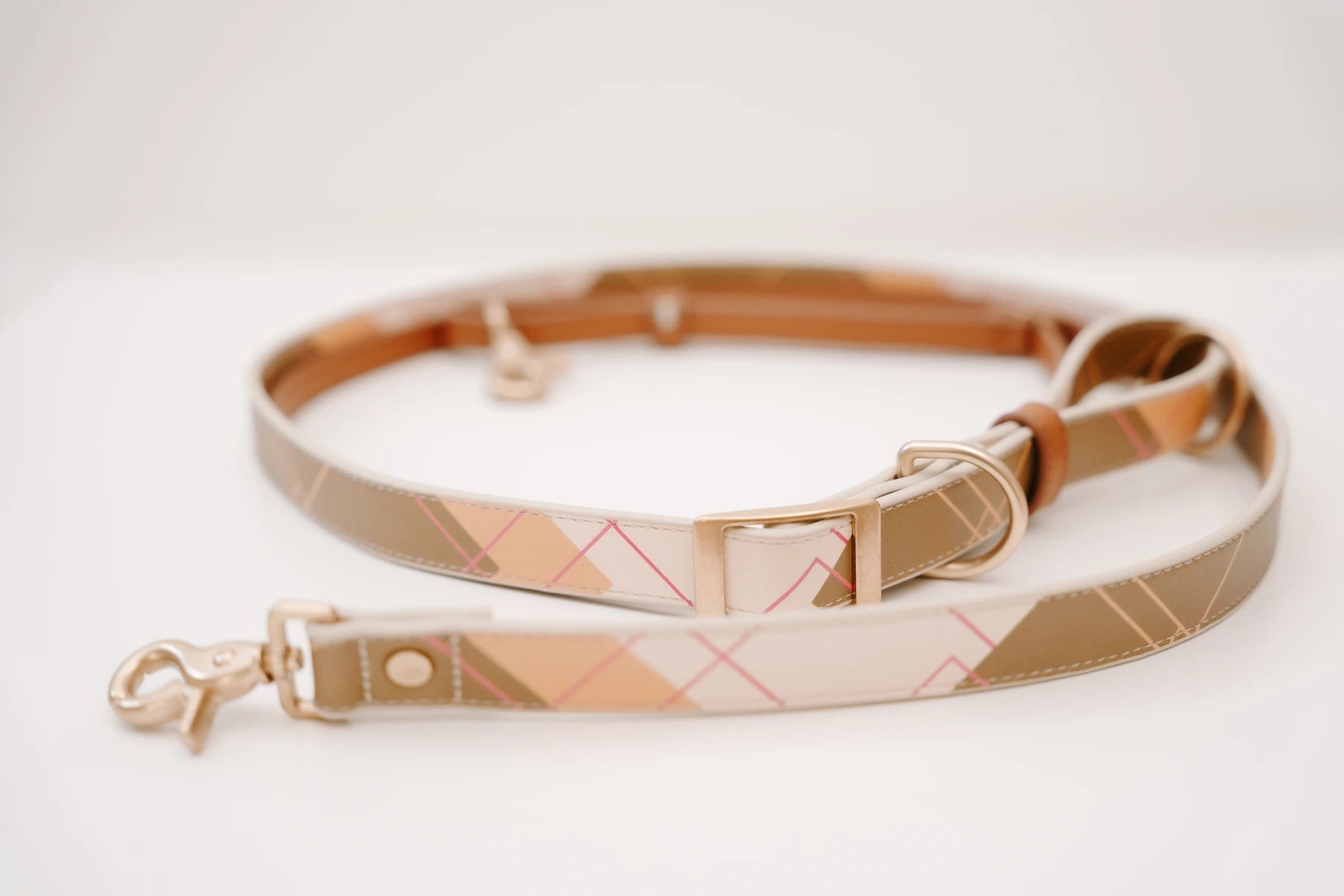 Unsere Handsfree Leine Nothing Really Matters nimmt das zeitlose Tartan-Muster in minimalistisch und kombiniert erdiges Khaki mit warmem Cognac und Magenta-Akzenten. Ein Klassiker mit Edge.