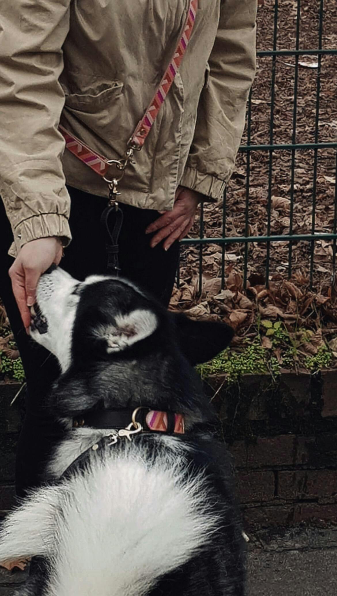 Die Leine liegt super leicht an und lässt sich perfekt quer tragen – wie eine schöne Handtasche. Und ich kann immer mit Nino im Partnerlook gehen, liebe das.