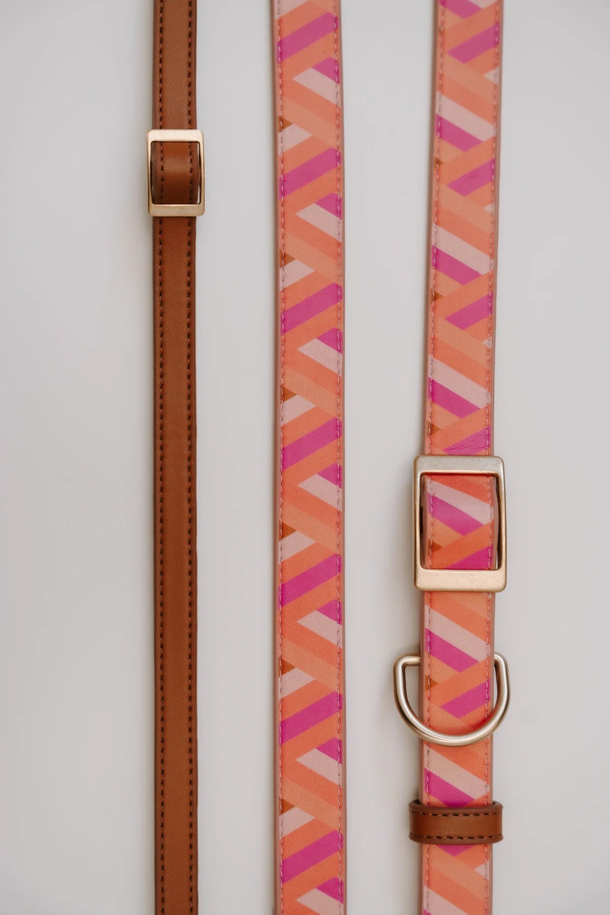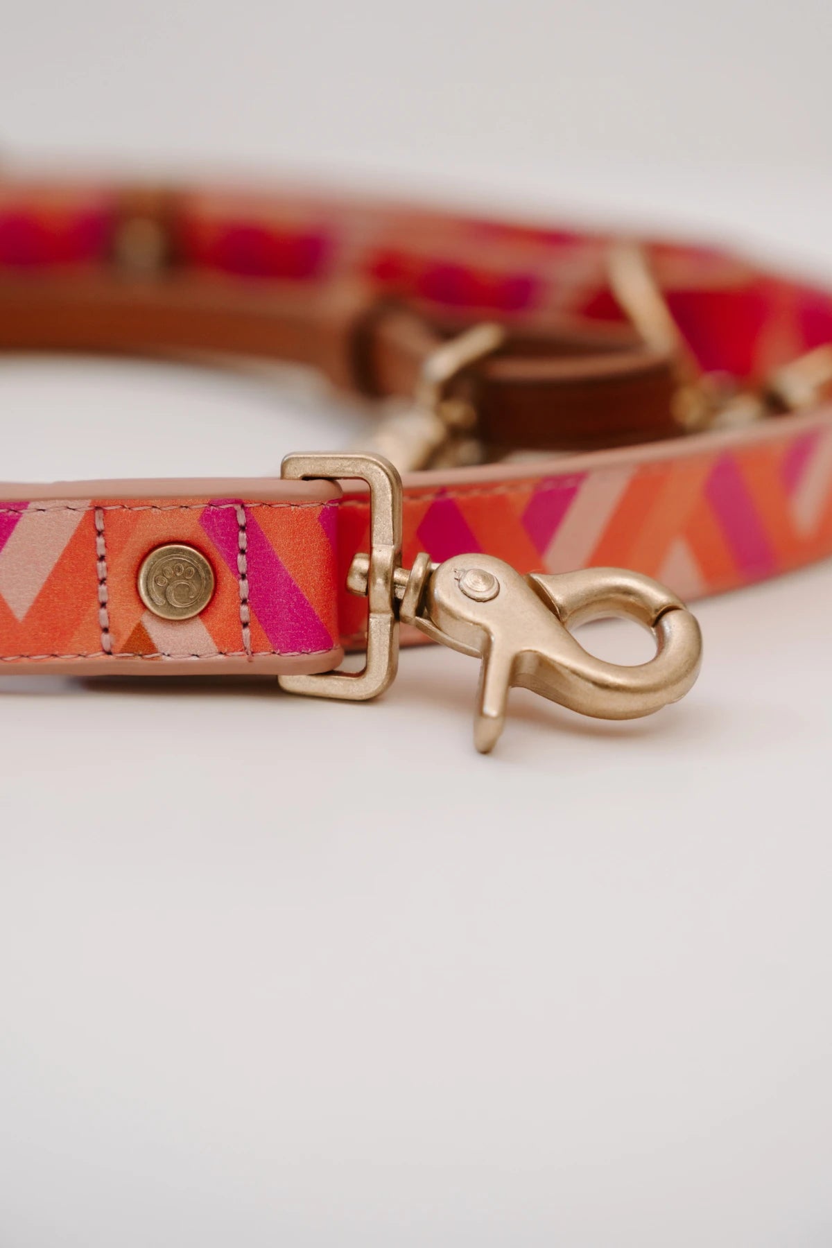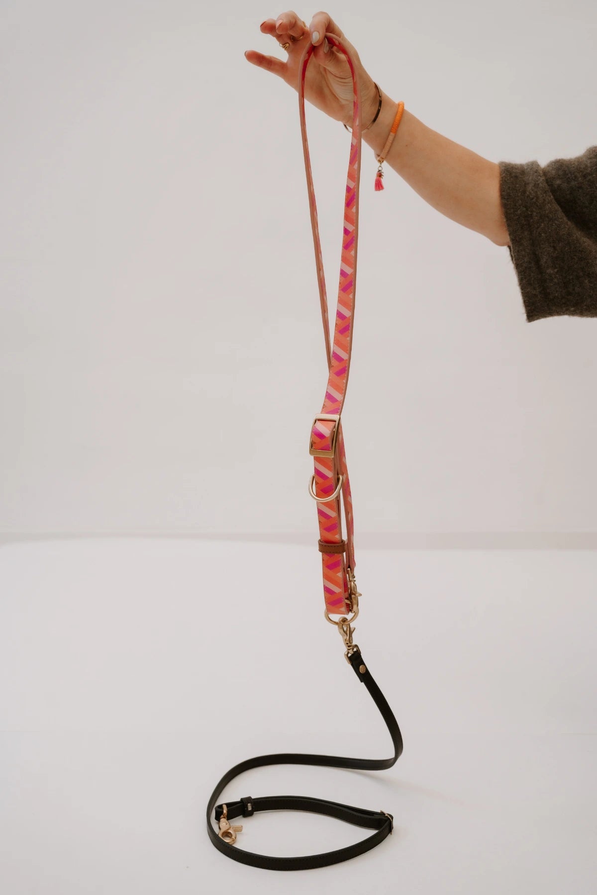 Unsere Handsfree Leine Is This The Real Life? kombiniert warme Koralle, sattes Rosa und Knallfarben-Akzente in abstrakten Blöcken. Ein Design für alle, die gesehen werden wollen.