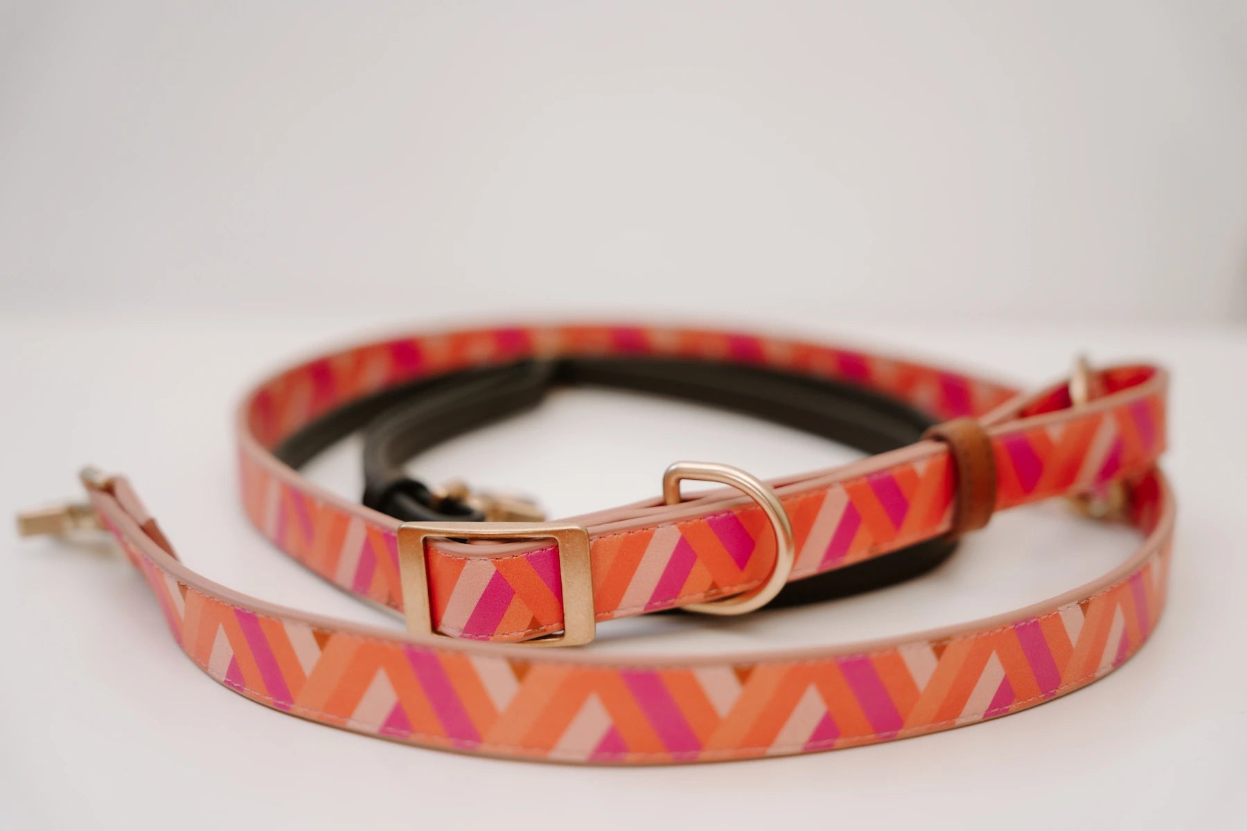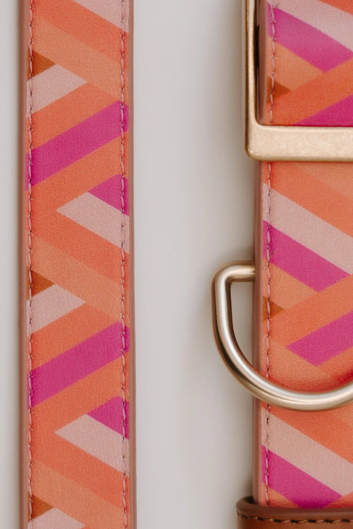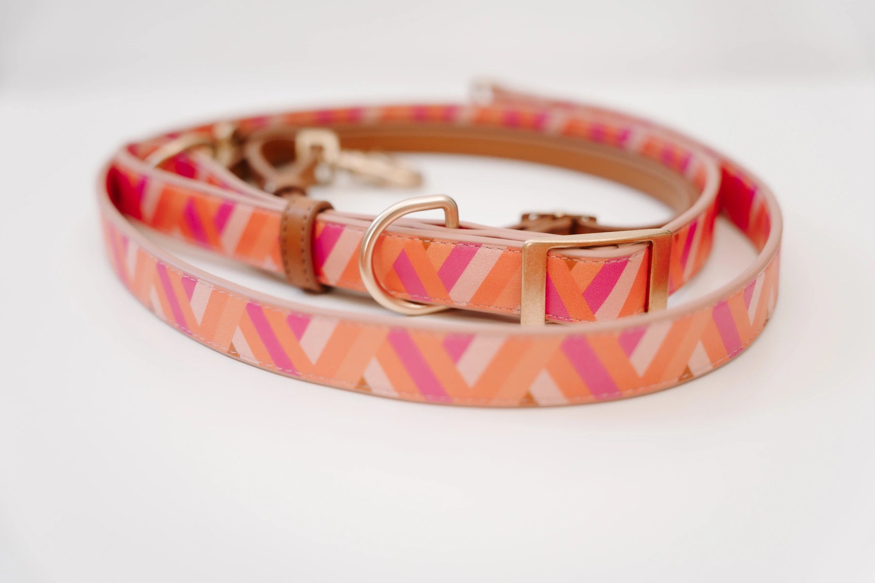 Unsere Handsfree Leine Is This The Real Life? kombiniert warme Koralle, sattes Rosa und Knallfarben-Akzente in abstrakten Blöcken. Ein Design für alle, die gesehen werden wollen.