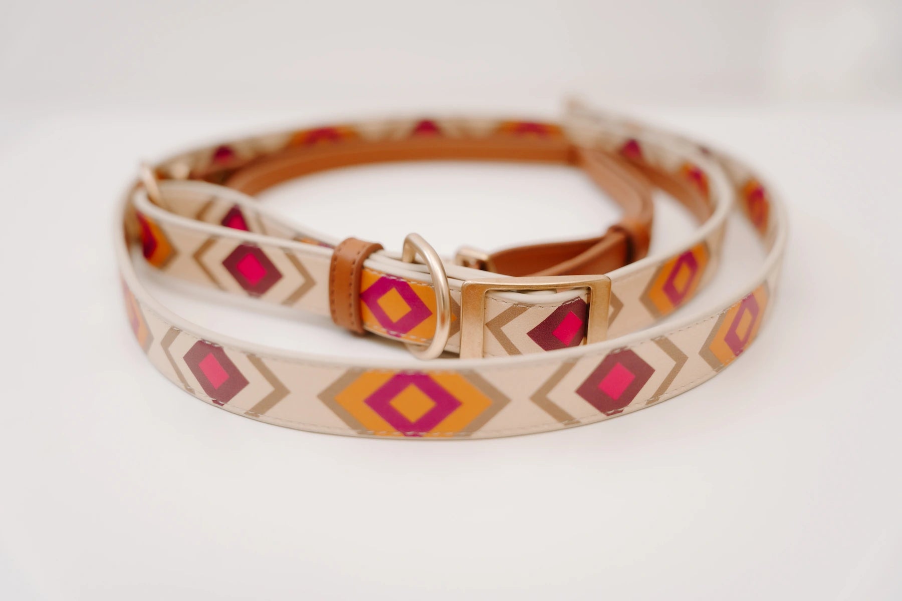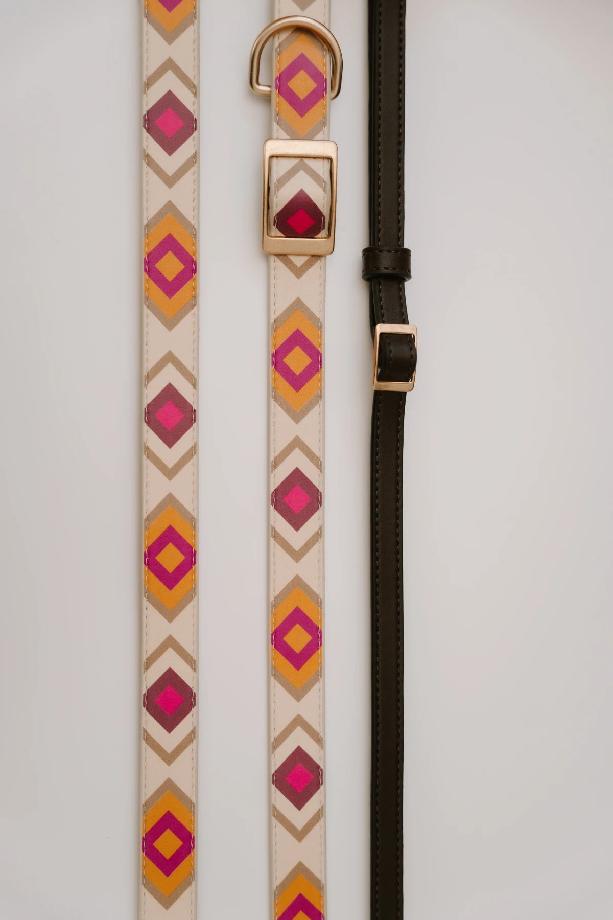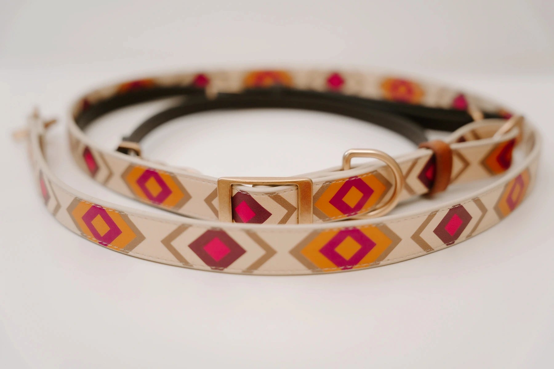 Unsere Handsfree Leine Scaramouche kombiniert klassisches Rautenmuster mit satten Beerentönen, warmem Cognac und Knallfarben-Akzenten. Ein Design, das nicht flüstert.