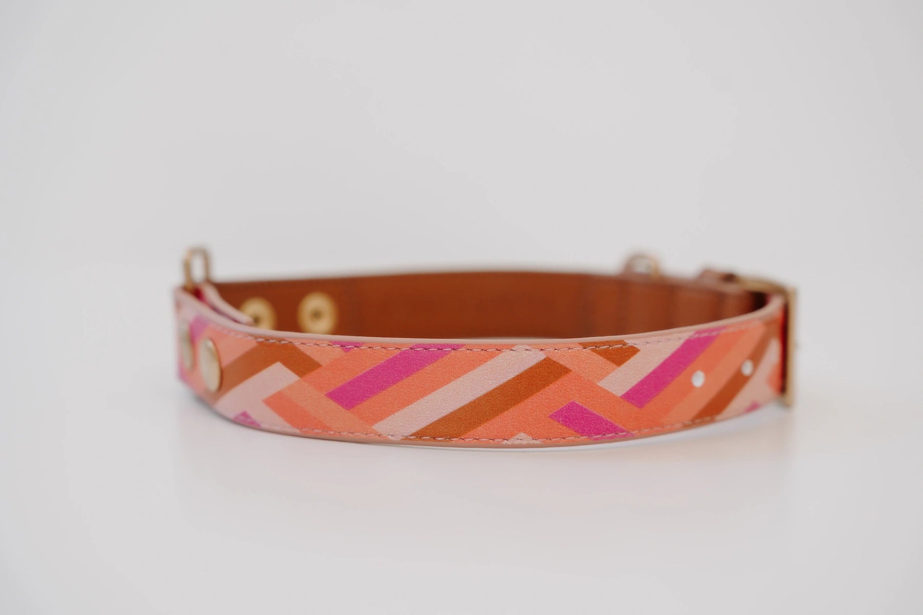 Is This The Real Life? kombiniert warme Koralle, sattes Rosa und Knallfarben-Akzente in abstrakten Blöcken. Ein Design für Hunde, die gesehen werden wollen.